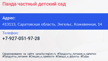 Панда, частный детский сад по адресу 413113, Саратовская область, Энгельс, Кожевенная, 14 в дальнейшем Организация, размещена в следующих категориях: