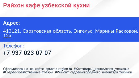 Райхон, кафе узбекской кухни по адресу 413121, Саратовская область, Энгельс, Марины Расковой, 12а в дальнейшем Организация, размещена в следующих категориях: