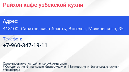Райхон, кафе узбекской кухни по адресу 413100, Саратовская область, Энгельс, Маяковского, 35 в дальнейшем Организация, размещена в следующих категориях: