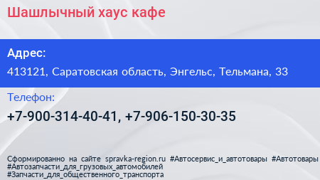 Шашлычный хаус, кафе по адресу 413121, Саратовская область, Энгельс, Тельмана, 33 в дальнейшем Организация, размещена в следующих категориях: