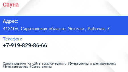 Сауна по адресу 413106, Саратовская область, Энгельс, Рабочая, 7 в дальнейшем Организация, размещена в следующих категориях: