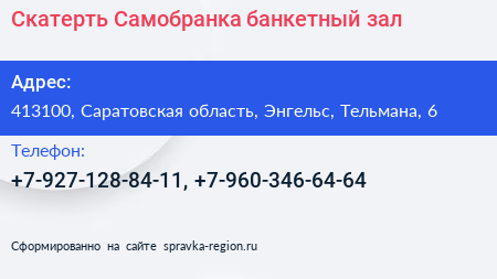 Скатерть Самобранка, банкетный зал по адресу 413100, Саратовская область, Энгельс, Тельмана, 6 в дальнейшем Организация, размещена в следующих категориях:
