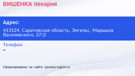 ВИШЕНКА, пекарня по адресу 413124, Саратовская область, Энгельс, Маршала Василевского, 37/2 в дальнейшем Организация, размещена в следующих категориях: