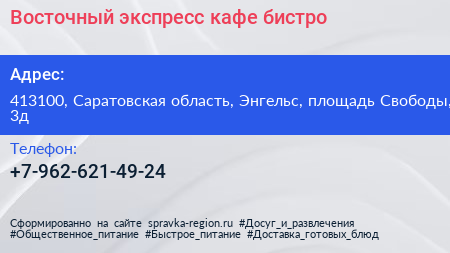 Восточный экспресс, кафе-бистро по адресу 413100, Саратовская область, Энгельс, площадь Свободы, 3д в дальнейшем Организация, размещена в следующих категориях: