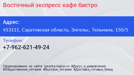Восточный экспресс, кафе-бистро по адресу 413111, Саратовская область, Энгельс, Тельмана, 150/5 в дальнейшем Организация, размещена в следующих категориях: