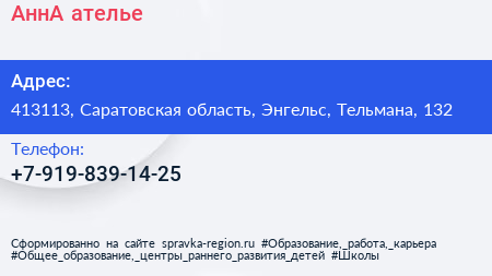 АннА, ателье по адресу 413113, Саратовская область, Энгельс, Тельмана, 132 в дальнейшем Организация, размещена в следующих категориях:
