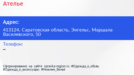 Ателье по адресу 413124, Саратовская область, Энгельс, Маршала Василевского, 50 в дальнейшем Организация, размещена в следующих категориях: