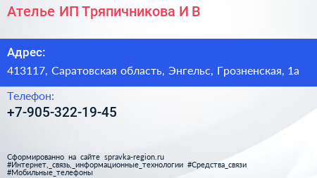 Ателье, ИП Тряпичникова И.В. по адресу 413117, Саратовская область, Энгельс, Грозненская, 1а в дальнейшем Организация, размещена в следующих категориях: