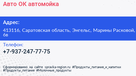 Авто-ОК, автомойка по адресу 413116, Саратовская область, Энгельс, Марины Расковой, 6в в дальнейшем Организация, размещена в следующих категориях: