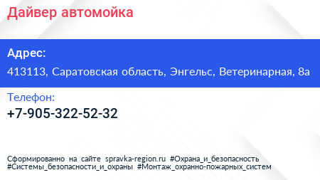 Дайвер, автомойка по адресу 413113, Саратовская область, Энгельс, Ветеринарная, 8а в дальнейшем Организация, размещена в следующих категориях: