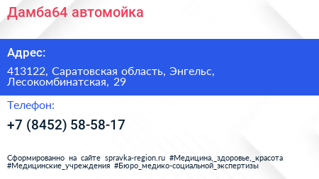 Дамба64, автомойка по адресу 413122, Саратовская область, Энгельс, Лесокомбинатская, 29 в дальнейшем Организация, размещена в следующих категориях: