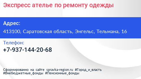 Экспресс, ателье по ремонту одежды по адресу 413100, Саратовская область, Энгельс, Тельмана, 16 в дальнейшем Организация, размещена в следующих категориях: