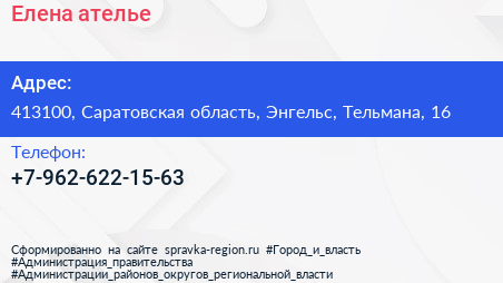 Елена, ателье по адресу 413100, Саратовская область, Энгельс, Тельмана, 16 в дальнейшем Организация, размещена в следующих категориях: