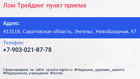 Лом-Трейдинг, пункт приема по адресу 413118, Саратовская область, Энгельс, Новобазарная, 47 в дальнейшем Организация, размещена в следующих категориях: