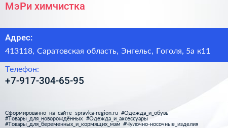 МэРи, химчистка по адресу 413118, Саратовская область, Энгельс, Гоголя, 5а к11 в дальнейшем Организация, размещена в следующих категориях: