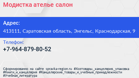 Модистка, ателье-салон по адресу 413111, Саратовская область, Энгельс, Краснодарская, 9 в дальнейшем Организация, размещена в следующих категориях:
