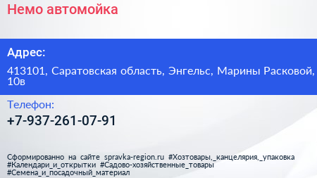 Немо, автомойка по адресу 413101, Саратовская область, Энгельс, Марины Расковой, 10в в дальнейшем Организация, размещена в следующих категориях: