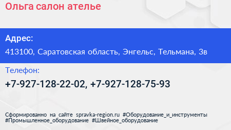 Ольга, салон-ателье по адресу 413100, Саратовская область, Энгельс, Тельмана, 3в в дальнейшем Организация, размещена в следующих категориях:
