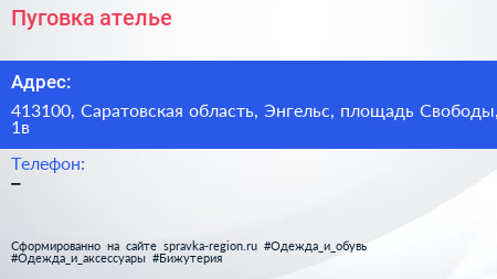 Пуговка, ателье по адресу 413100, Саратовская область, Энгельс, площадь Свободы, 1в в дальнейшем Организация, размещена в следующих категориях: