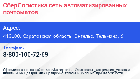СберЛогистика, сеть автоматизированных почтоматов по адресу 413100, Саратовская область, Энгельс, Тельмана, 6 в дальнейшем Организация, размещена в следующих категориях: