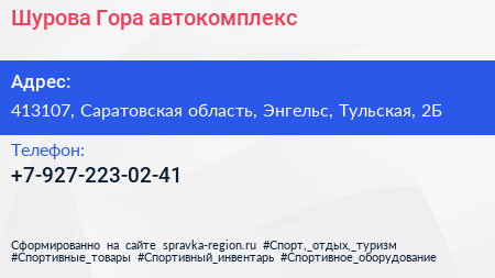 Шурова Гора, автокомплекс по адресу 413107, Саратовская область, Энгельс, Тульская, 2Б в дальнейшем Организация, размещена в следующих категориях: