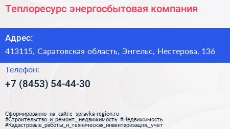 Теплоресурс, энергосбытовая компания по адресу 413115, Саратовская область, Энгельс, Нестерова, 136 в дальнейшем Организация, размещена в следующих категориях: