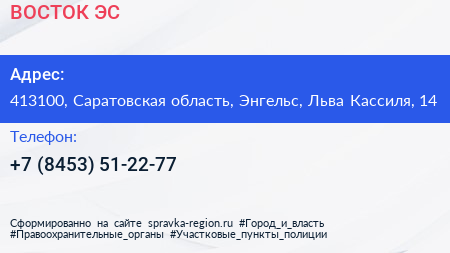 ВОСТОК ЭС по адресу 413100, Саратовская область, Энгельс, Льва Кассиля, 14 в дальнейшем Организация, размещена в следующих категориях:
