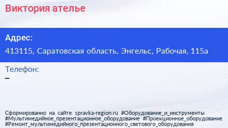 Виктория, ателье по адресу 413115, Саратовская область, Энгельс, Рабочая, 115а в дальнейшем Организация, размещена в следующих категориях: