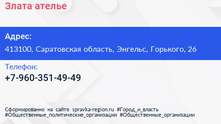 Злата, ателье по адресу 413100, Саратовская область, Энгельс, Горького, 26 в дальнейшем Организация, размещена в следующих категориях: