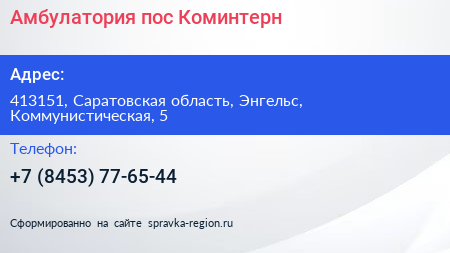 Амбулатория, пос. Коминтерн по адресу 413151, Саратовская область, Энгельс, Коммунистическая, 5 в дальнейшем Организация, размещена в следующих категориях: