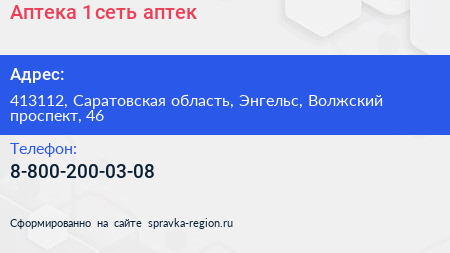Аптека №1, сеть аптек по адресу 413112, Саратовская область, Энгельс, Волжский проспект, 46 в дальнейшем Организация, размещена в следующих категориях: