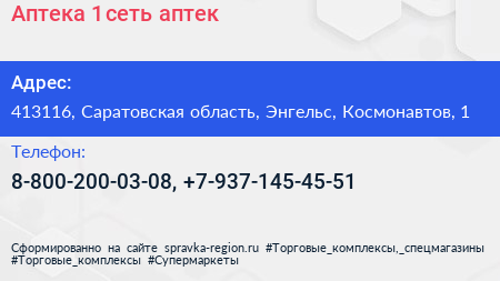 Аптека №1, сеть аптек по адресу 413116, Саратовская область, Энгельс, Космонавтов, 1 в дальнейшем Организация, размещена в следующих категориях: