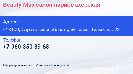 Beauty Max, салон-парикмахерская по адресу 413100, Саратовская область, Энгельс, Тельмана, 23 в дальнейшем Организация, размещена в следующих категориях: