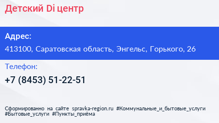 Детский Di центр по адресу 413100, Саратовская область, Энгельс, Горького, 26 в дальнейшем Организация, размещена в следующих категориях: