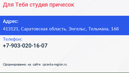 Для Тебя, студия причесок по адресу 413121, Саратовская область, Энгельс, Тельмана, 168 в дальнейшем Организация, размещена в следующих категориях: