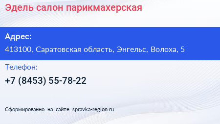 Эдель, салон-парикмахерская по адресу 413100, Саратовская область, Энгельс, Волоха, 5 в дальнейшем Организация, размещена в следующих категориях: