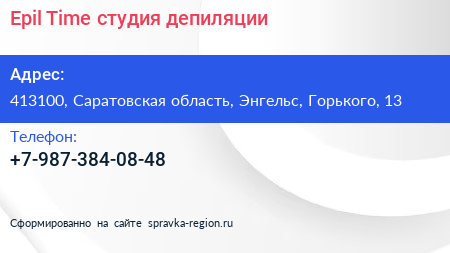 Epil Time, студия депиляции по адресу 413100, Саратовская область, Энгельс, Горького, 13 в дальнейшем Организация, размещена в следующих категориях: