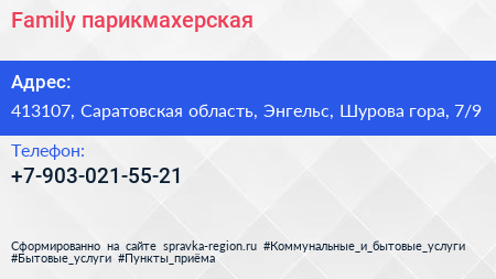 Family, парикмахерская по адресу 413107, Саратовская область, Энгельс, Шурова гора, 7/9 в дальнейшем Организация, размещена в следующих категориях: