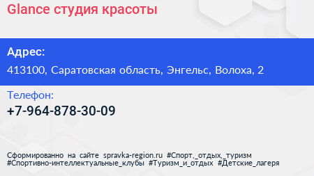 Glance, студия красоты по адресу 413100, Саратовская область, Энгельс, Волоха, 2 в дальнейшем Организация, размещена в следующих категориях:
