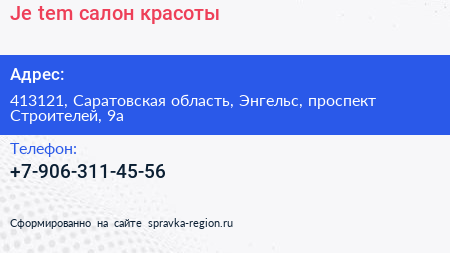 Je`tem, салон красоты по адресу 413121, Саратовская область, Энгельс, проспект Строителей, 9а в дальнейшем Организация, размещена в следующих категориях: