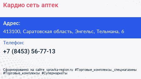 Кардио, сеть аптек по адресу 413100, Саратовская область, Энгельс, Тельмана, 6 в дальнейшем Организация, размещена в следующих категориях: