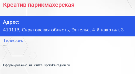 Креатив, парикмахерская по адресу 413119, Саратовская область, Энгельс, 4-й квартал, 3 в дальнейшем Организация, размещена в следующих категориях: