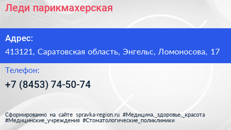 Леди, парикмахерская по адресу 413121, Саратовская область, Энгельс, Ломоносова, 17 в дальнейшем Организация, размещена в следующих категориях:
