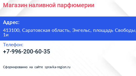 Магазин наливной парфюмерии по адресу 413100, Саратовская область, Энгельс, площадь Свободы, 1и в дальнейшем Организация, размещена в следующих категориях: