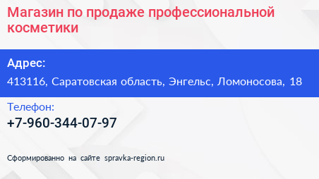 Магазин по продаже профессиональной косметики по адресу 413116, Саратовская область, Энгельс, Ломоносова, 18 в дальнейшем Организация, размещена в следующих категориях: