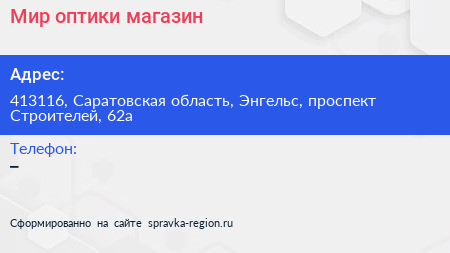 Мир оптики, магазин по адресу 413116, Саратовская область, Энгельс, проспект Строителей, 62а в дальнейшем Организация, размещена в следующих категориях: