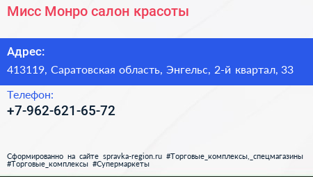 Мисс Монро, салон красоты по адресу 413119, Саратовская область, Энгельс, 2-й квартал, 33 в дальнейшем Организация, размещена в следующих категориях: