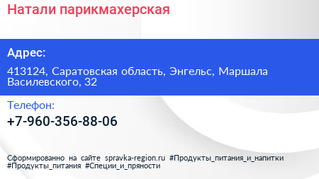 Натали, парикмахерская по адресу 413124, Саратовская область, Энгельс, Маршала Василевского, 32 в дальнейшем Организация, размещена в следующих категориях:
