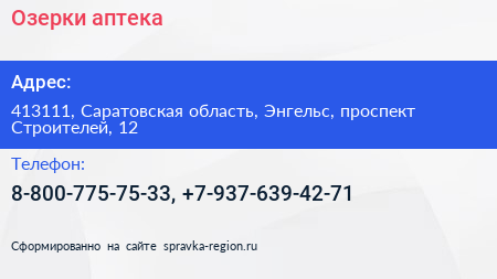 Озерки, аптека по адресу 413111, Саратовская область, Энгельс, проспект Строителей, 12 в дальнейшем Организация, размещена в следующих категориях: