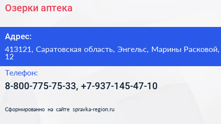 Озерки, аптека по адресу 413121, Саратовская область, Энгельс, Марины Расковой, 12 в дальнейшем Организация, размещена в следующих категориях: